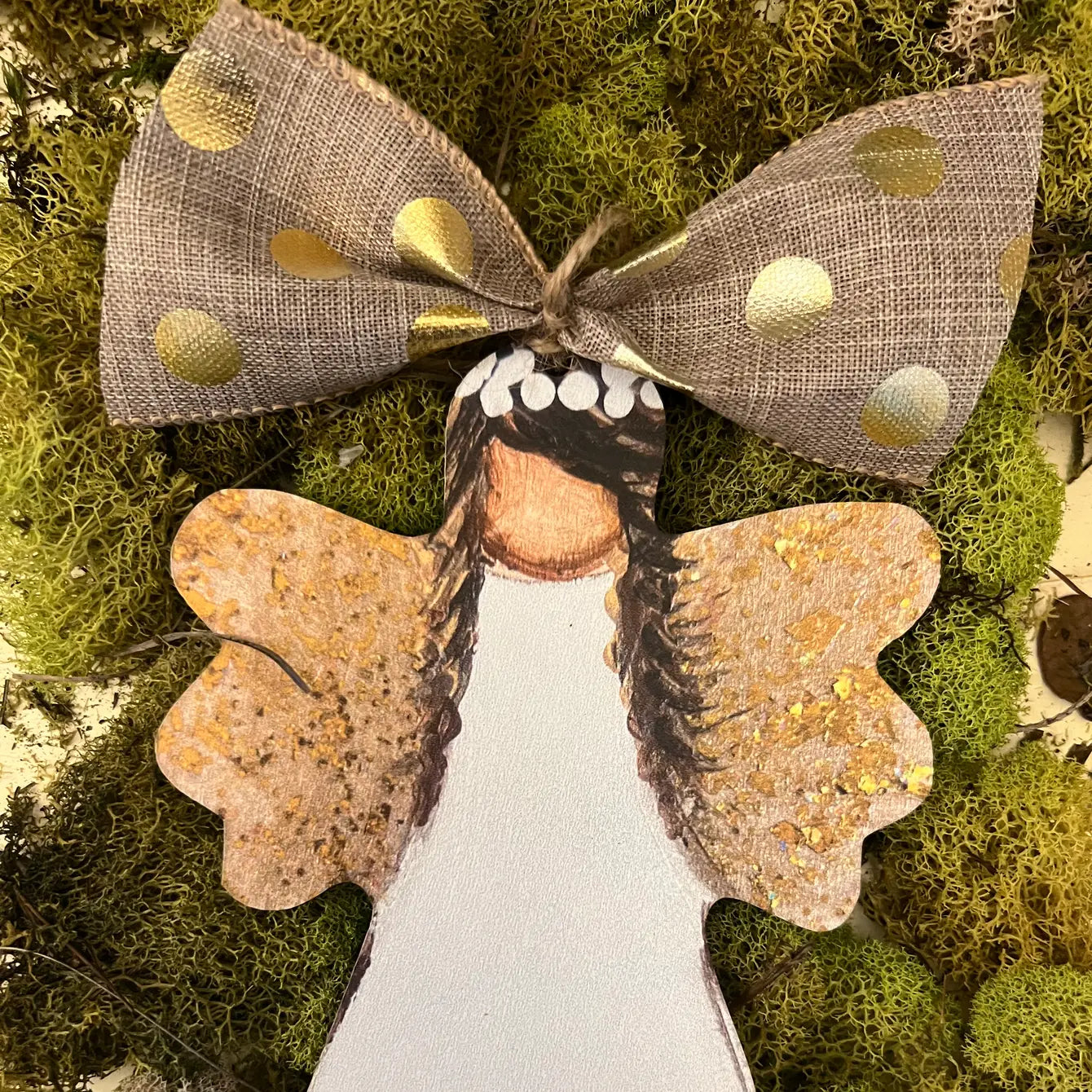 Discover The Happy Butterfly's custom Christmas ornaments, UV printed directly onto premium wood. Each piece, like our gold winged angel, beautifully captures a traditional Christmas with a country and farmhouse feel. The vibrant colors and visible paintbrush strokes bring these American-made designs to life.