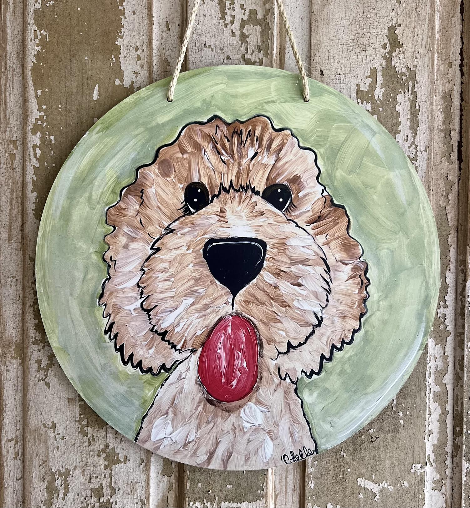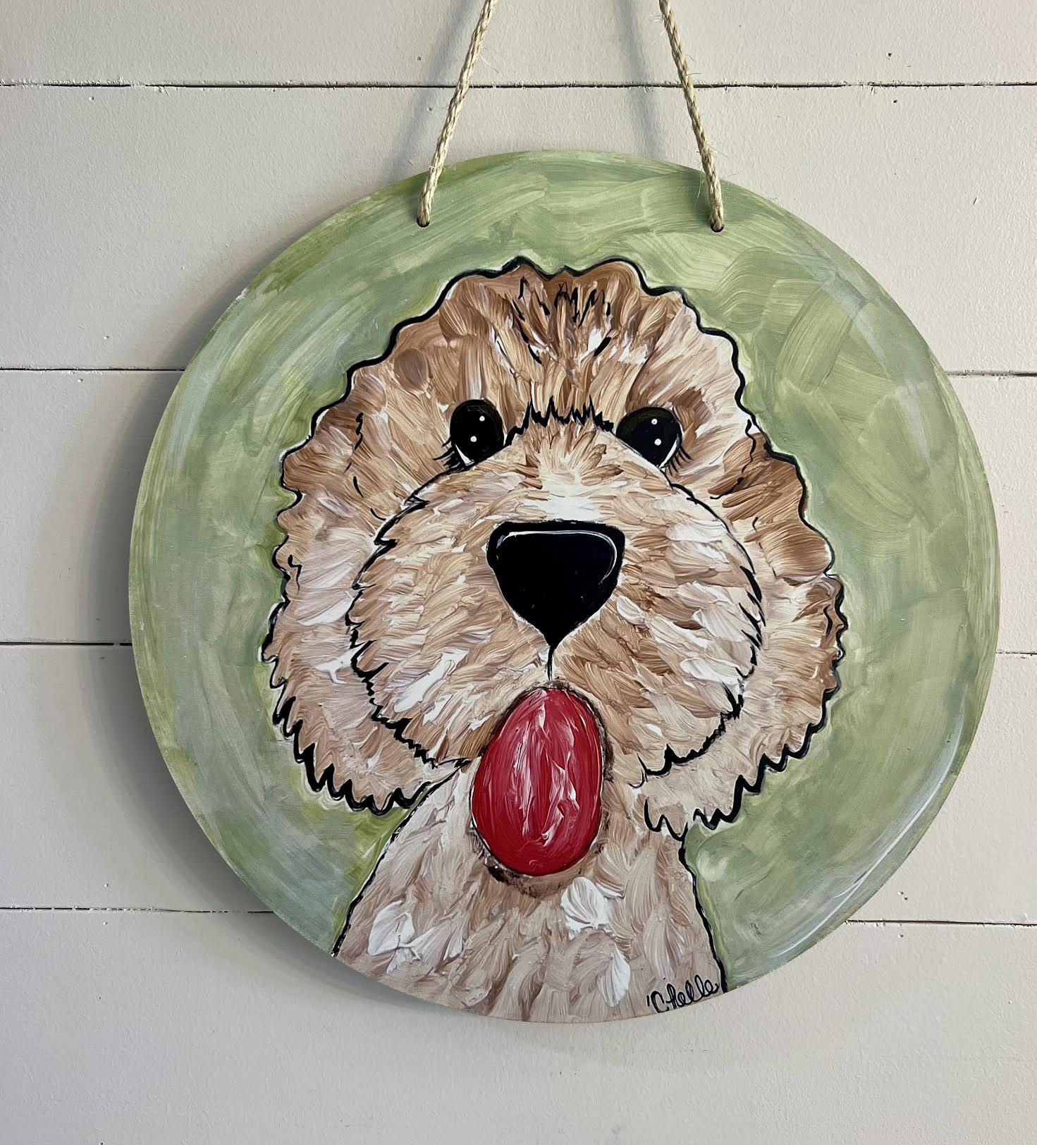 Meet Buddy Barks, the happiest golden doodle on the block This charming 18-inch wooden door hanger features a soft light green background with Buddy Barks front and center—a blond, happy golden doodle full of warmth and personality.